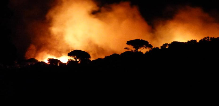 Derrière les collines, l’incendie forme des poches de clarté, toujours aussi conquérant grâce à un vent qui n’a presque pas perdu de puissance. Dans la journée de lundi, certaines rafales ont atteint les 100 km/h.