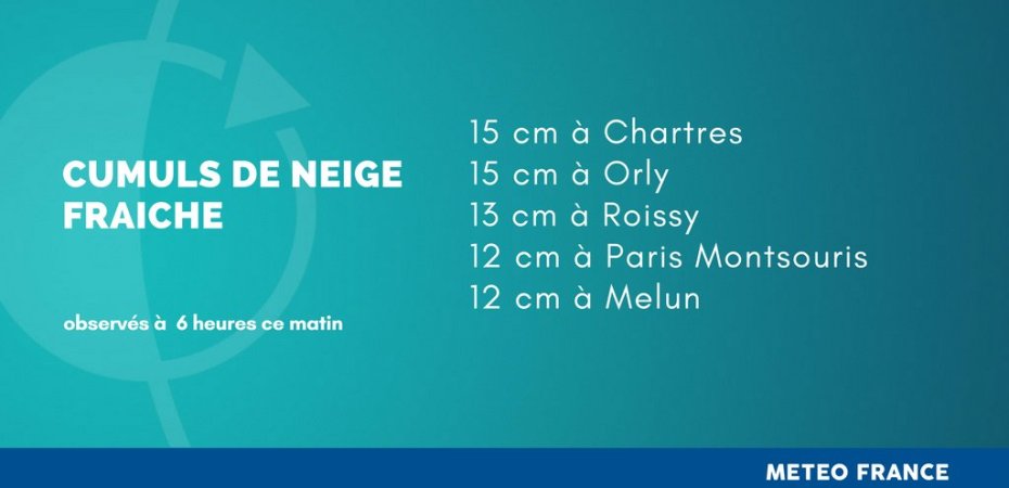 Une épaisseur inédite depuis l’hiver 1987. Au moins 12 cm de neige sont tombés depuis mardi soir sur Paris, et jusqu’à 20 cm localement en Ile-de-France, selon les relevés communiqués par Météo France, mercredi 7 février.