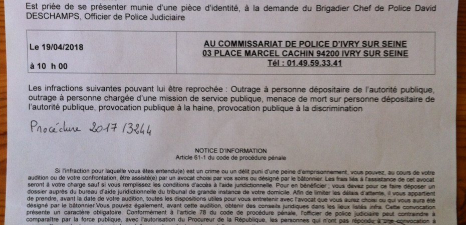 Un fait très troublant, le gardien de la paix brigadier-chef David Deschamps a l’audace de convoquer Xavier Jaffré pour des faits prescrits depuis un an.